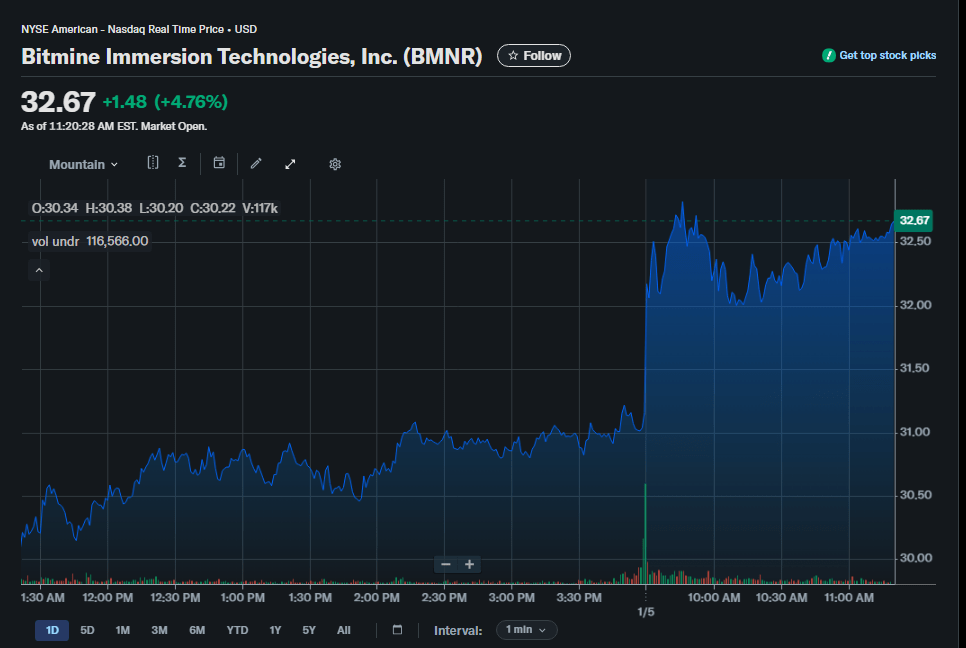BitMine Immersion Technologies bought 32,977 Ethereum (ETH) in a move that grabbed investor attention and pushed its stock higher. The purchase was reported to be part of the company’s recent accumulation of crypto assets during the final week of 2025. BMNR shares rallied as traders reacted to the disclosure, with early session gains seen on US exchanges.